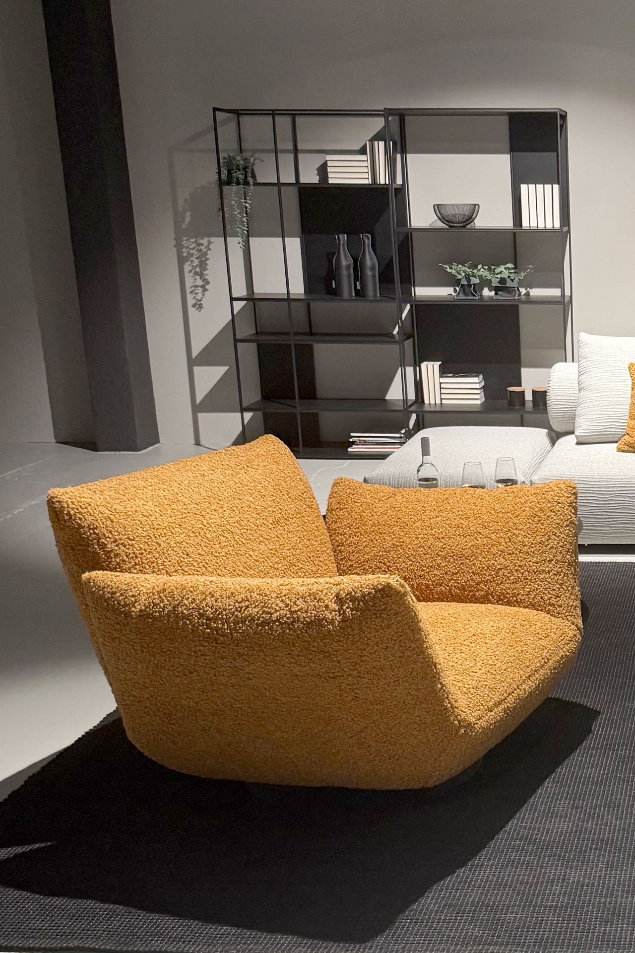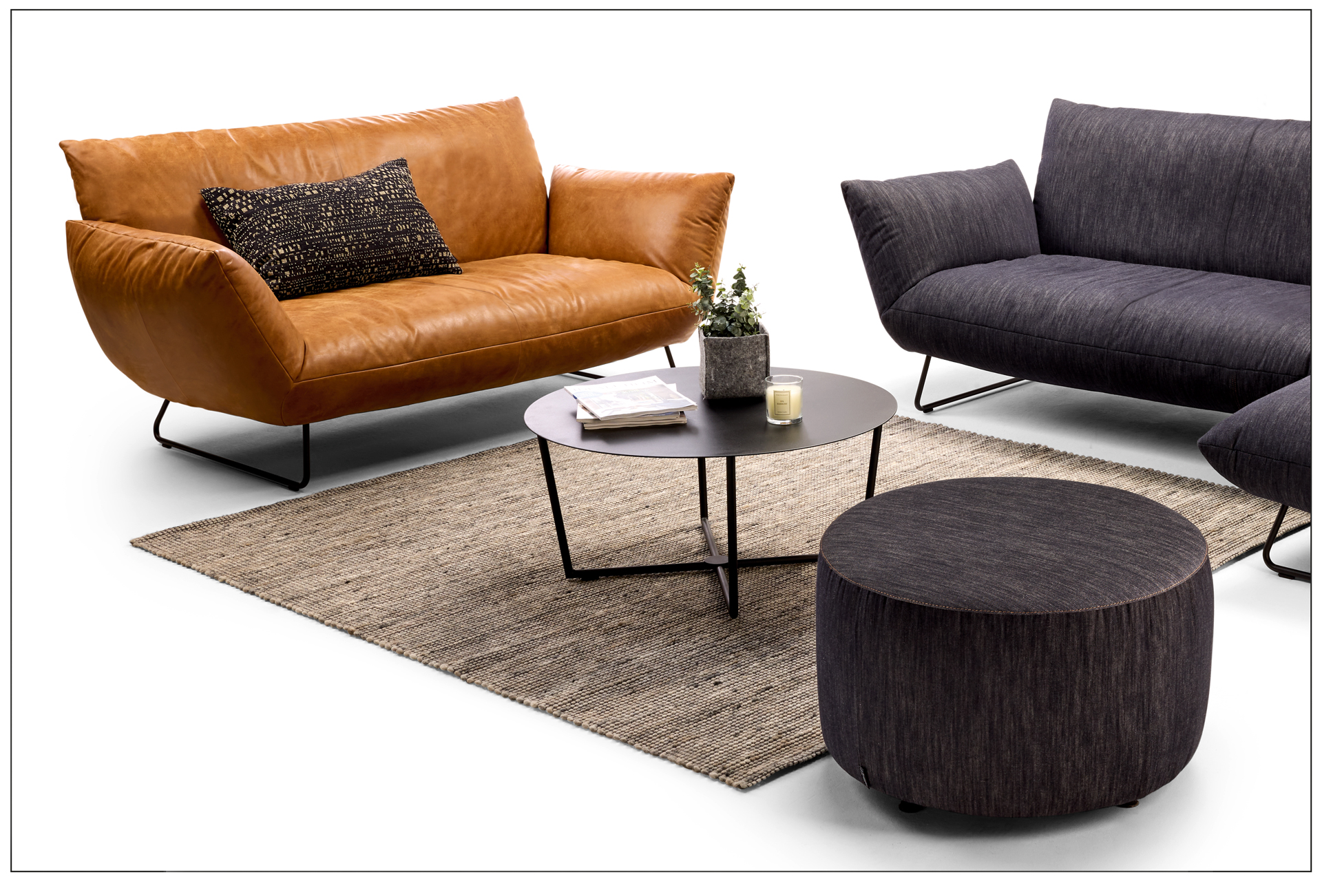 EXTRAVAGANT DESIGN. MAXIMUM COMFORT. PURE RELAXATION. OPTIONALLY AVAILABLE AS A ROTARY AND ROCKING CHAIR, ARMCHAIR, SOFA, LOUNGER AND RECAMIERE. ELEMENTS WITH A CUSHION LOOK ON A METAL BASE FRAME, MATT FINE STRUCTURE POWDER-COATED. LARGE SELECTION OF TEXTILES AND LEATHERS. UNIQUE PIECE PRODUCTION.