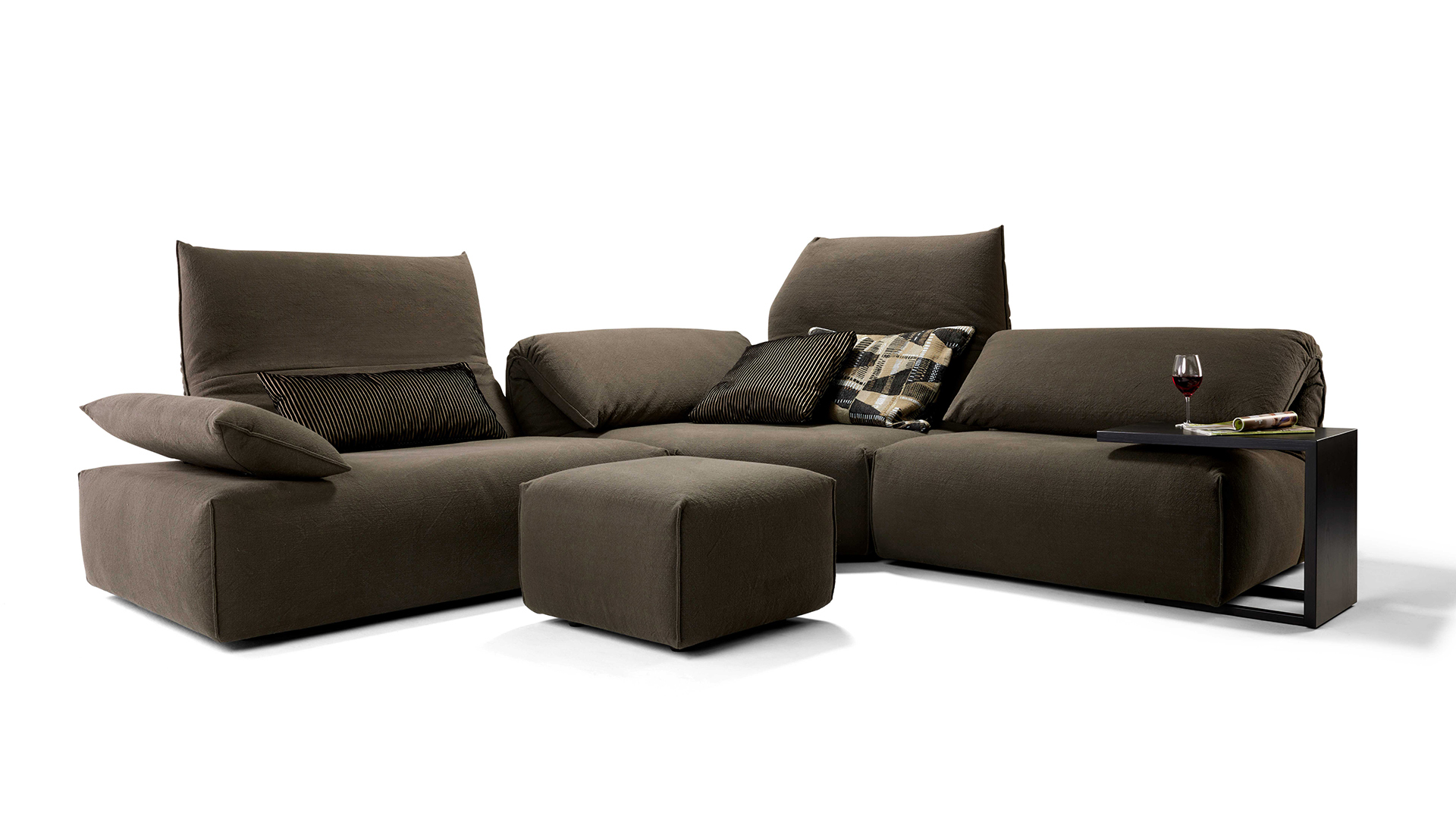 YOUR RETREAT AT HOME. AN ISLAND OF PEACE AND STRENGTH. A RETREAT FROM EVERYDAY LIFE! ELEMENTS WITH MODERN HIGH-BACK COMFORT! THE CUBIC BASIC SHAPE COMBINED WITH A CASUAL LOOK AND EXCELLENT FUNCTIONALITY CHARACTERISE THE DESIGN. ADJUSTABLE BACKRESTS AND HEADRESTS ALLOW INDIVIDUAL SITTING AND LYING POSITIONS. THE SEAT DEPTH IS REGULATED WITH THE HELP OF THE FOLDING MECHANISM. THE CORNER SECTION, FUNCTIONALLY SPECIAL, TURNS THE SOFA INTO A COSY CAVE. UNIQUE PIECE PRODUCTION.