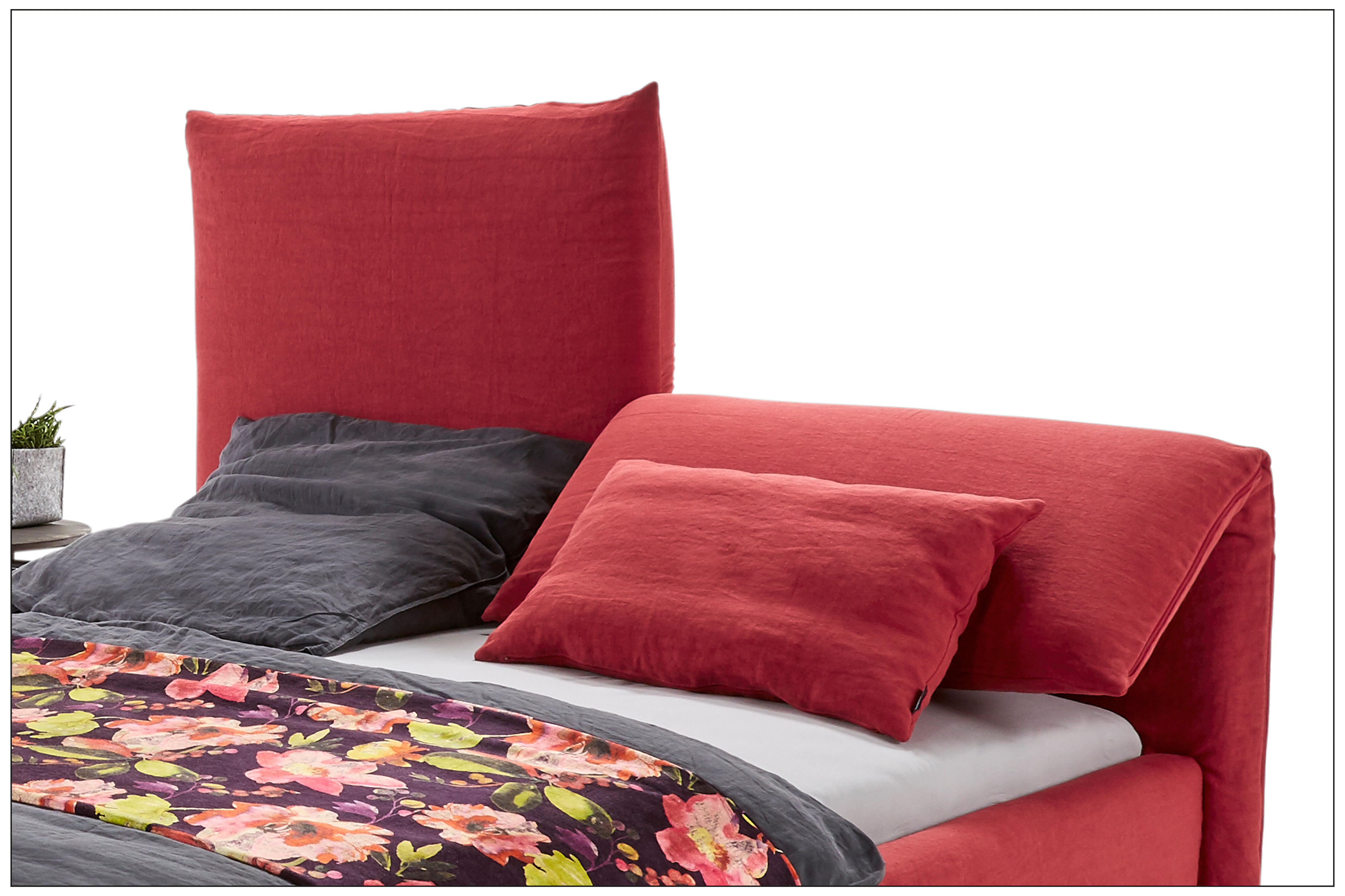 SMART COUNTRY STYLE. MORE THAN JUST SLEEPING. BED IN SMART COUNTRY HOUSE STYLE. THE FOLDABLE HEADREST TRANSFORMS INTO A COMFORTABLE BACKREST. CASUAL COVER (REMOVABLE AND CLEANABLE). FEATURES SUCH AS ZIPPER OR BOX PLEAT ON HEADBOARD AND FOOTBOARD ADD A SPECIAL TOUCH. AVAILABLE IN DIFFERENT WIDTHS. LARGE SELECTION OF FABRICS. UNIQUE PIECE PRODUCTION.
