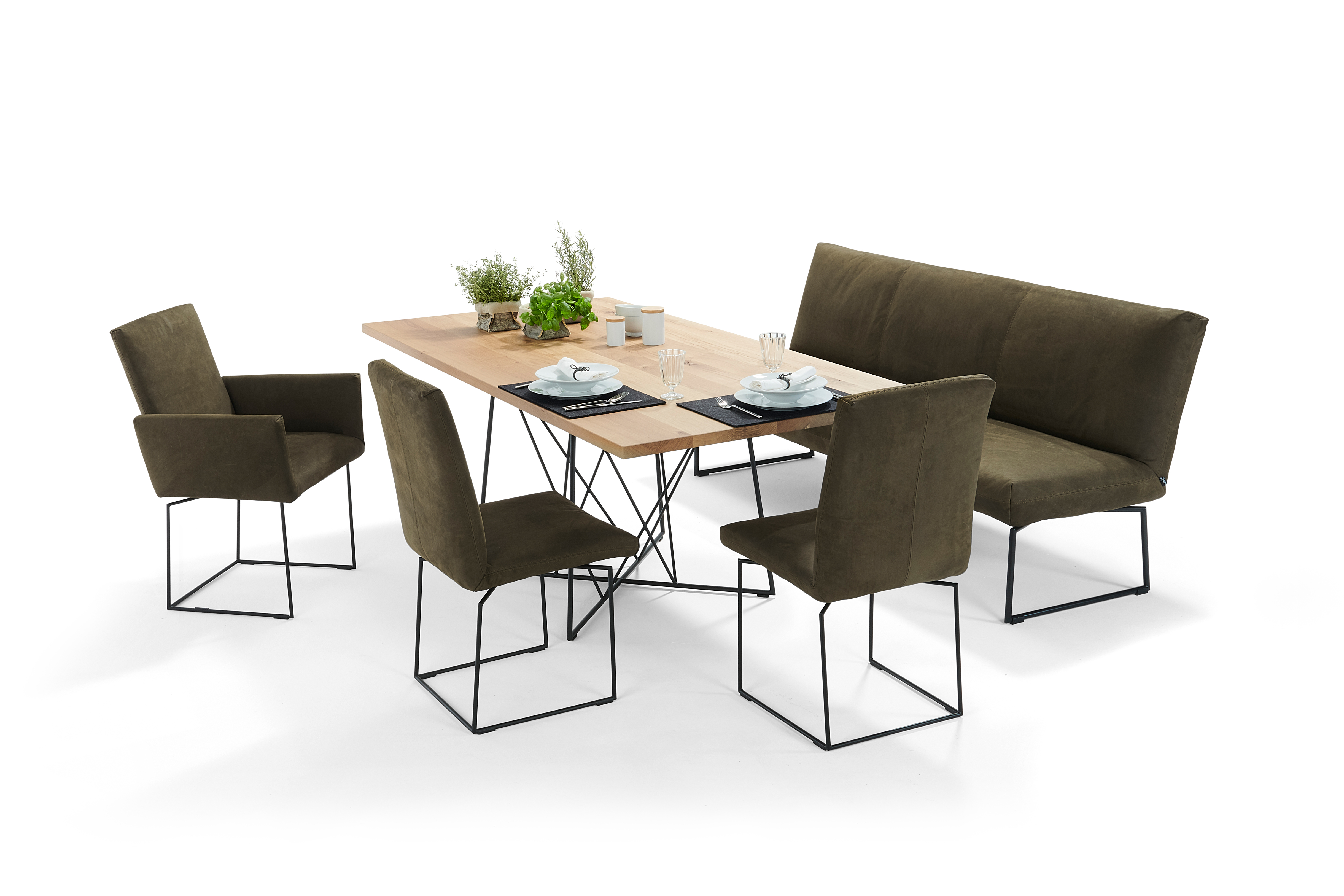 ENJOY THE GOOD TIMES. EIN ESSPLATZ ZUM WOHLFÜHLEN. POLSTERBANK MIT SOFAFEELING. STÜHLE, SOFT GEPOLSTERT, MIT VERSTELLBAREM RÜCKENTEIL. MIT UND OHNE ARMTEIL. TISCH MIT MASSIVER HOLZPLATTE, ERHÄLTLICH IN VERSCHIEDENEN GRÖSSEN. STÜHLE UND TISCH AUF FILIGRANEM METALLUNTERGESTELL, SCHWARZ MATT FEINSTRUKTUR BESCHICHTET. VERSCHIEDENE HOLZARTEN UND BEZÜGE (STOFF/LEDER) WÄHLBAR. ALS UNIKAT GEFERTIGT.