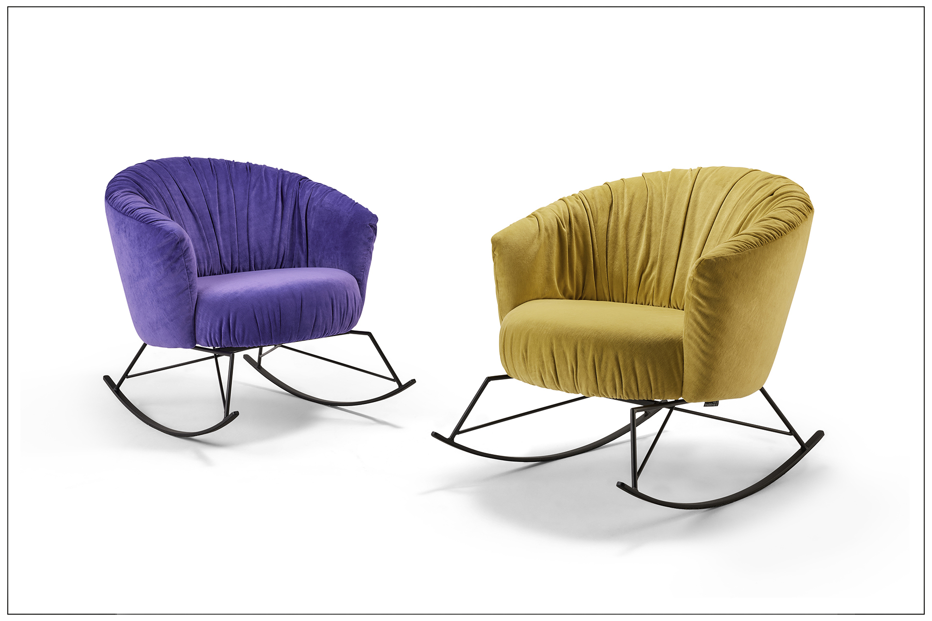 SAY CHEERS! ENTSPANNTES, SANFTES DREHEN (TYP 146) ODER SCHAUKELN (TYP 109). EINZIGARTIGER SITZKOMFORT DURCH FEST GEPOLSTERTEN RÜCKEN UND TASCHENFEDERKERN IM SITZ. DEKORATIVE PLISSIERUNG DES BEZUGES. LÄSSIGER SCHNITT. ALS UNIKAT GEFERTIGT.