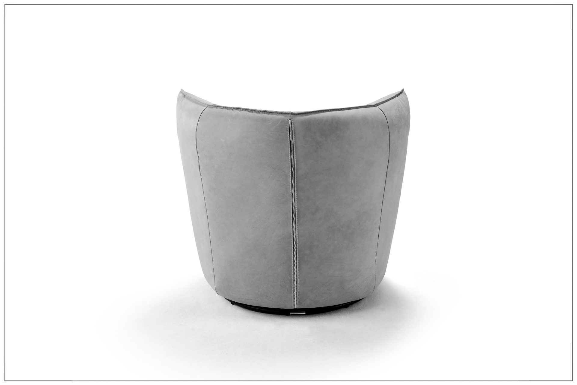 MODERNER DREH- UND SCHAUKELSESSEL MIT DEKORATIVEM REISSVERSCHLUSS AUF DER RÜCKSEITE. STYLISCHE NAHTVERARBEITUNG IN DER FARBE ROST. GEMÜTLICHER SITZKOMFORT FÜR MAXIMALE ENTSPANNUNG. DAZU PASSENDER HOCKER MIT SOFTPOLSTERUNG. ALS UNIKAT GEFERTIGT.