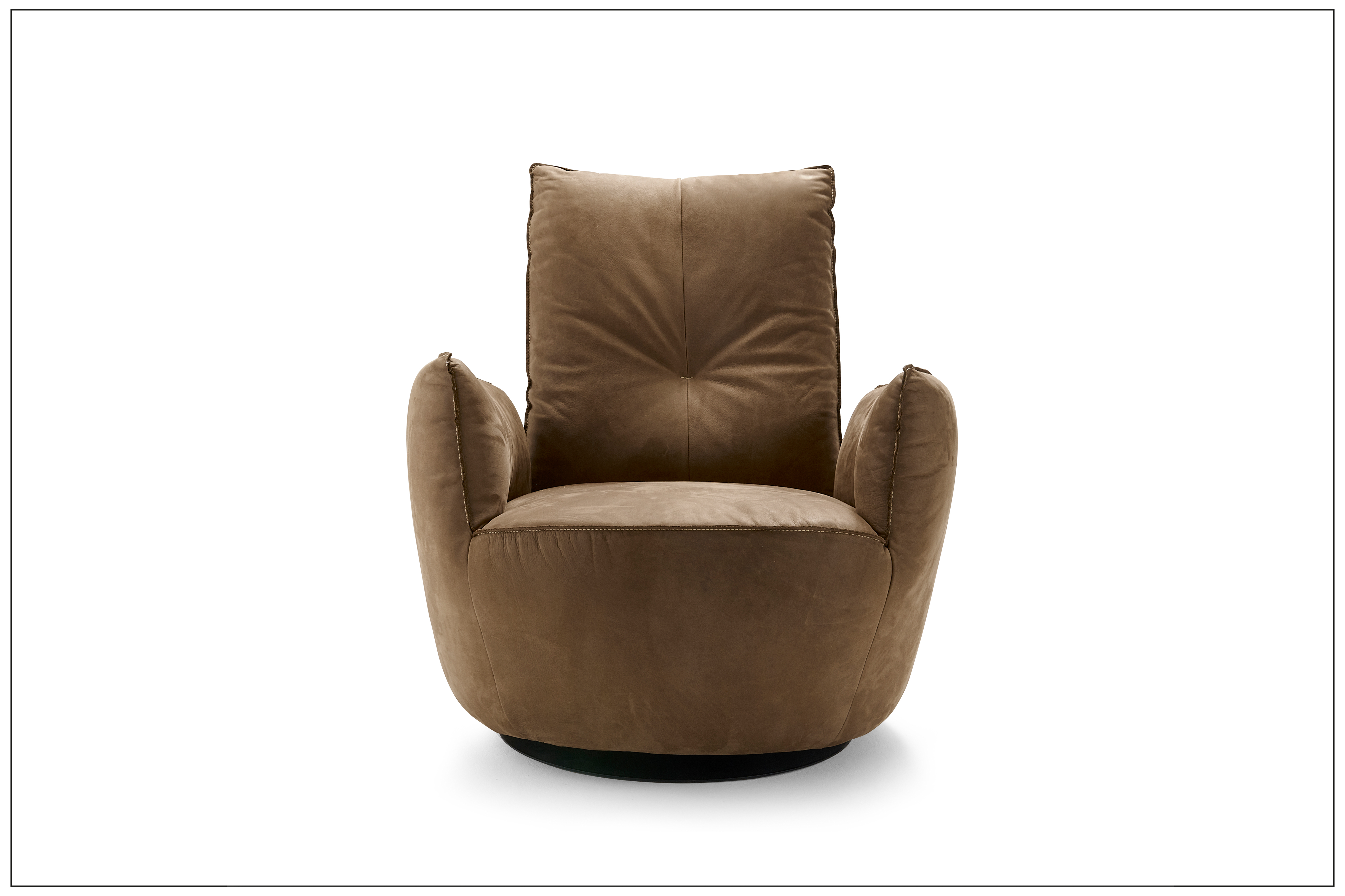 LET'S SWING AND FEEL GOOD. CASUAL, RELAXED DESIGN. A PLACE TO FEEL GOOD. UPHOLSTERY IN SOFT CUSHION LOOK. THE SWIVEL CHAIR WITH HIGH BACK SHELL AND 360° SWIVEL FUNCTION OFFERS MAXIMUM SEATING COMFORT. BASE PLATE MADE OF STEEL, BLACK STRUCTURE-COATED FOR A FIRM STAND. THE LARGE SELECTION OF COVERS, EITHER IN FINE LEATHERS OR IN PATTERNED / PLAIN FABRICS, CHANGES THE APPEAL OF THE SMART PIECE. UNIQUE PIECE PRODUCTION.