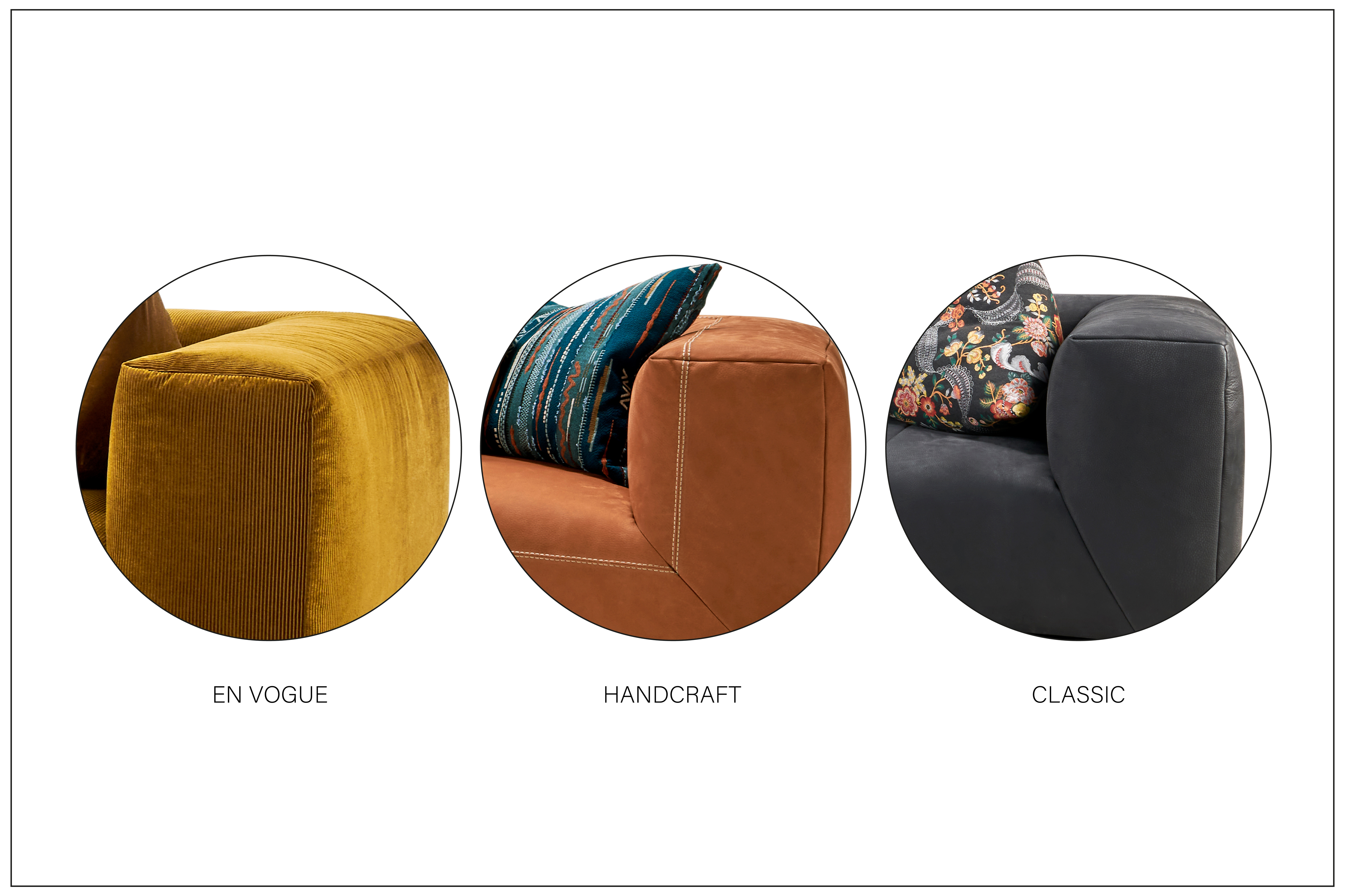ONE SOFA RANGE - 3 DIFFERENT LOOKS! AS THE NAME SUGGESTS - SPHINX! STRAIGHT CUBIC FORM AND HIGH QUALITY COMFORTABLE UPHOLSTERED ELEMENTS ARE THE BASIS FOR THE DESIRED CONFIGURATION IN THE ROOM. SELECTABLE IN 3 VARIATIONS: 1. CLASSIC - PURE LEATHER 2. HANDCRAFT - LEATHER WITH MANUFACTURED SEAMS 3. EN VOGUE - TEXTILE LOOK WONDERFULLY SOFT CUSHIONS, FOR THE COMFORT AND THE LOOK, UNDERLINE THE INDIVIDUAL LOOK. COVERS AVAILABLE IN LEATHER AND FABRIC FROM OUR LARGE COLLECTION. UNIQUE PIECE PRODUCTION.