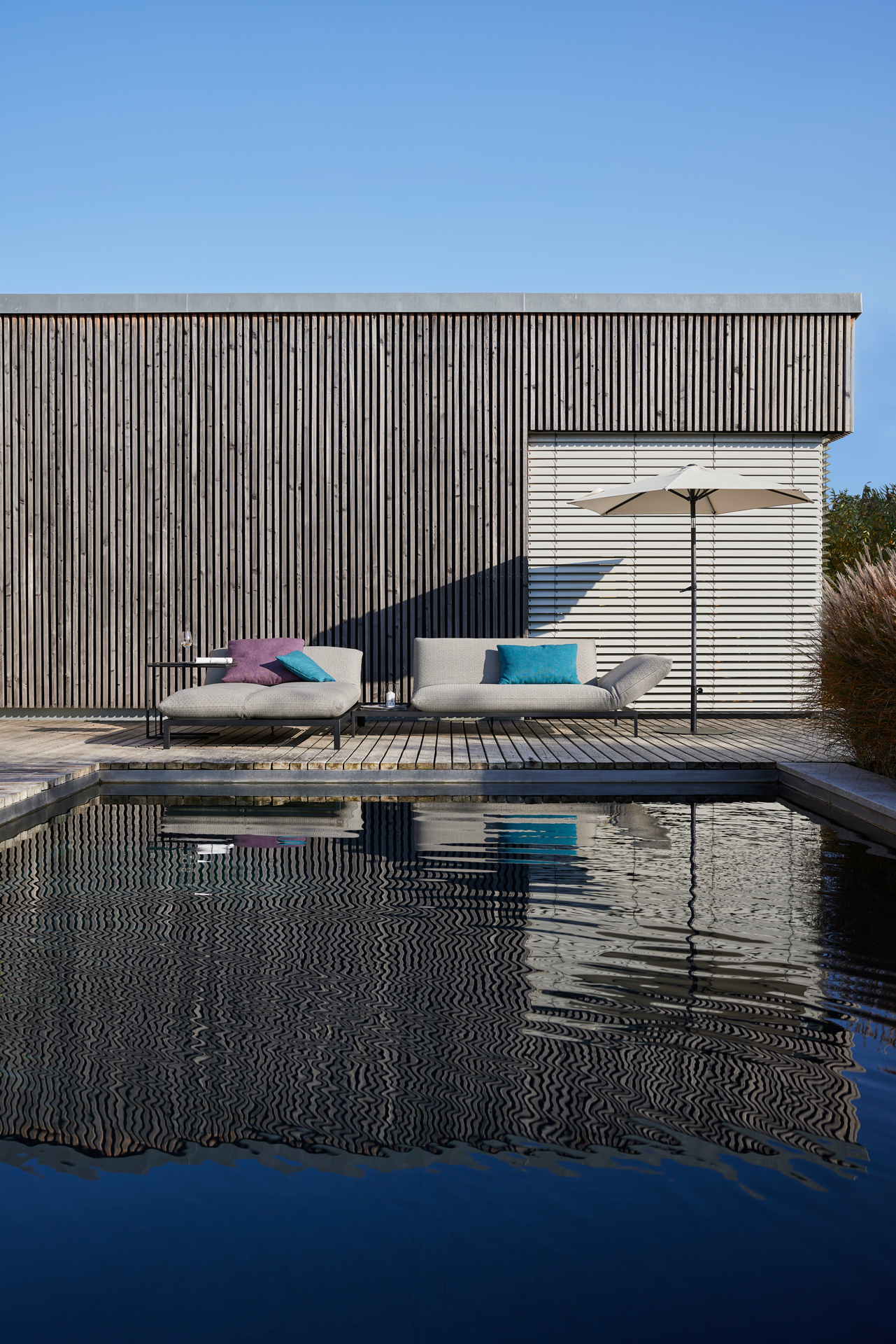 THE FREAK CORNER. THE BULLFROG SUCCESS FUNCTION IN A NEW DESIGN. PURISTICALLY CLEAR. ELEMENTS MANUALLY SLIDABLE BY 40 cm. THE METAL FRAME WITH SLIDING FUNCTION IS PARTICULARLY IMPORTANT FOR OUTDOOR USE. LESS WEIGHT AND HARDLY ANY SPACE FOR WATER TO ACCUMULATE. INDIVIDUAL TYPE FINISHES AND OUTDOOR FABRICS CAN BE SELECTED. MATCHING: WIND- AND RAINPROOF COVERS. UNIQUE PIECE PRODUCTION.