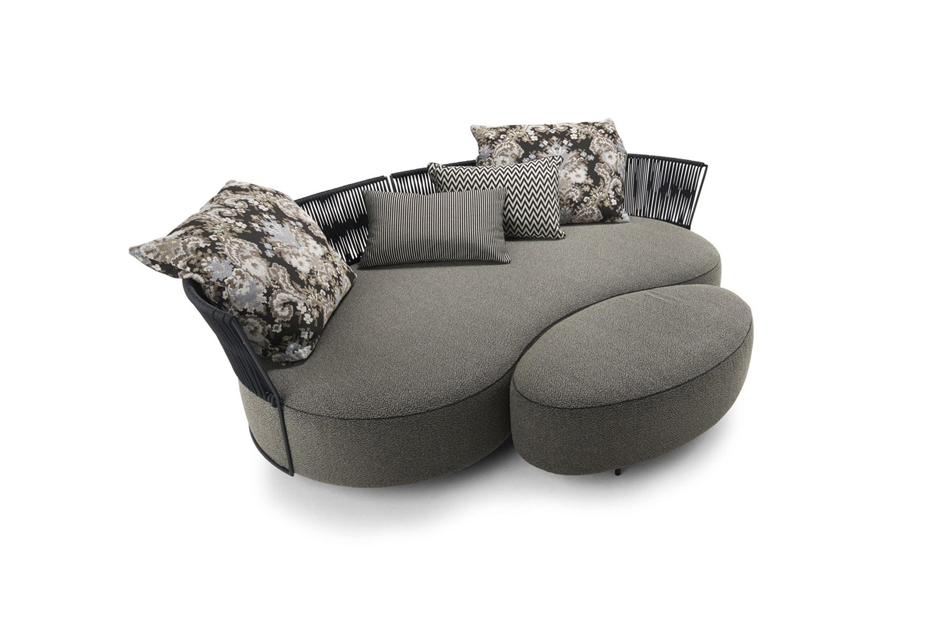 TOUCH THE BREEZE... THE LUXURY OF THE UNUSUAL. A LARGE SOFA WITH A CURVED LINE AND THE AESTHETICS OF SOMETHING SPECIAL. OUTDOOR LOUNGING WITH SUMMERTIME FEELING. THE FILIGREE BACK MADE OF STEEL BRAIDED WITH A TRANSPARENT LOOKING LACING MAKES THIS SOFA TO AN OUTDOOR-MAJESTY. THE OVAL STOOL PART, AS WELL AS DIFFERENT CUSHIONS PROVIDE FOR THE INDIVIDUAL BACK COMFORT. UNIQUE PIECE PRODUCTION.