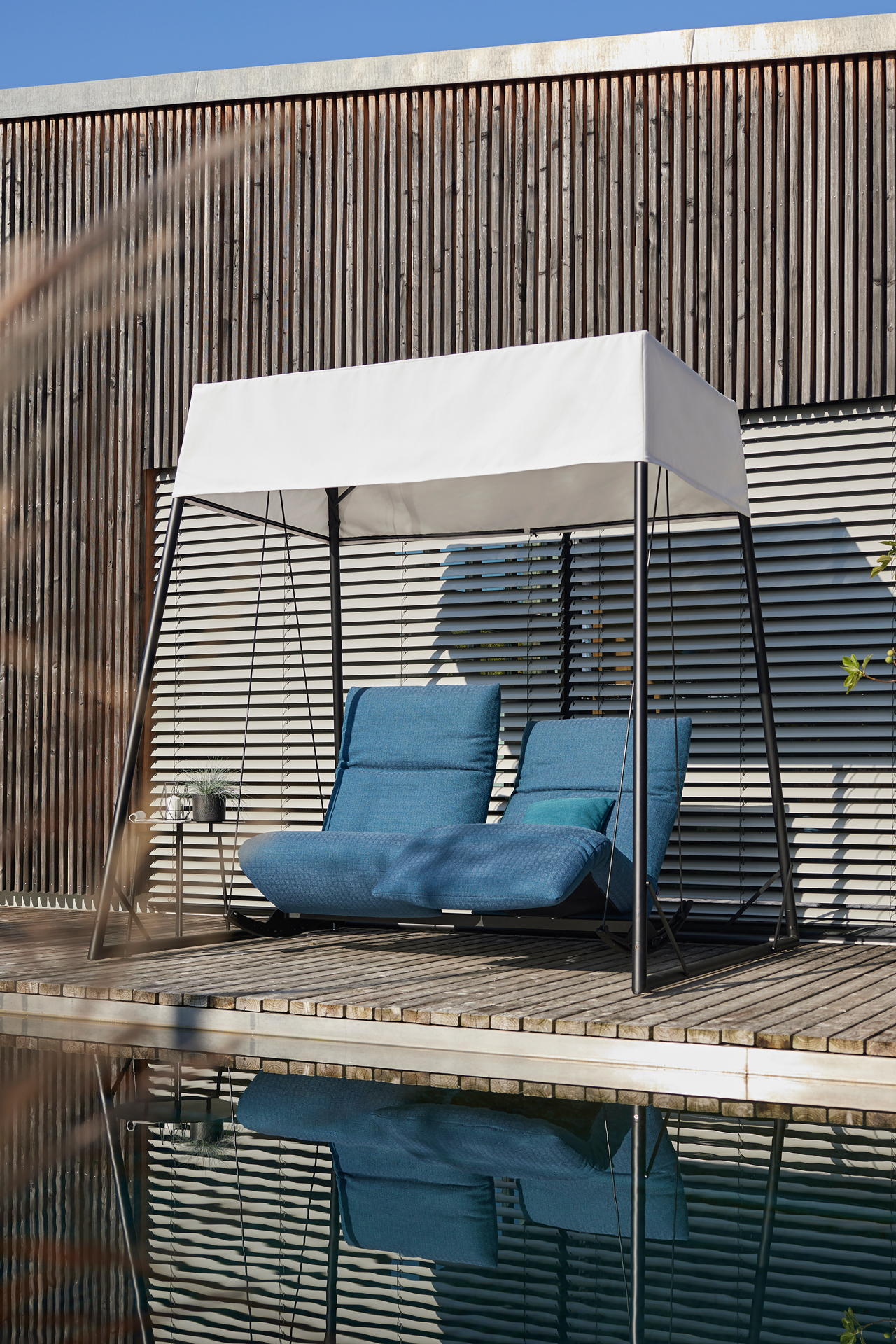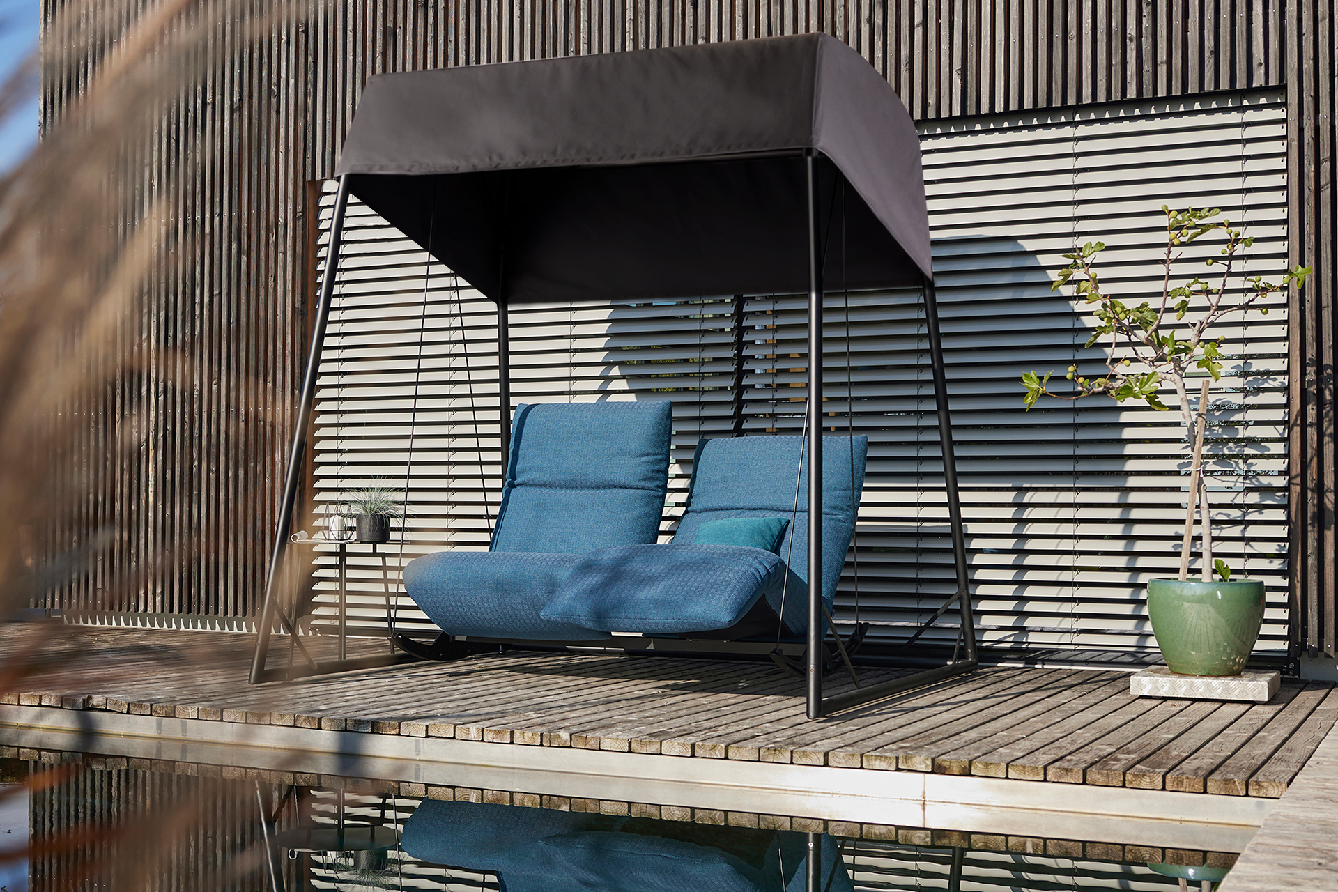 MAGIC SWING. TAKE OFF OR STAY ON THE FLOOR ROCKING. BOTH IS POSSIBLE WITH OUR FAVOURITE SOFA OR ARMCHAIR ROCKFROG. GENTLY ROCKING YOU CAN FIND YOUR PREFERRED POSITION WITH THE SMOOTH AND INFINITE ADJUSTMENT OF THE SEAT AND BACK SECTION. EACH SEAT ALONE AND YET TOGETHER. A PLACE TO RELAX AND LET GO. ROCKING CHAIR / SOFA: THE ROCKING SKIDS ALLOW FOR A GENTLE SWING. THE INFINITELY, MOTORISED SEAT ADJUSTMENT LEADS UP TO THE „HEART BALANCE POSITION“. ROPE SWING CHAIR / SOFA: AT ANY TIME THE HANGING ROPE CAN BE ATTACHED TO THE ROCKFROG. THEN THE MOVEMENTS BECOME WIDER AND YOU BEGIN TO FLY. BODY AND MIND COME TO REST. EVEN NOW THE DESIRED BACK AND SEAT POSITION IS INFINITELY ADJUSTABLE. ROCKFROG IS AVAILABLE WITH OR WITHOUT ARMREST - AS DOUBLE OR SINGLE SEATER. AN EYE-CATCHER OUTDOORS. SWIVEL FUNCTION: ARMCHAIR 180FD WITH TWO ARMRESTS AND A SWIVEL FUNCTION. THE SEATING AND BACKREST POSITIONS CAN ALSO BE ADJUSTED CONTINUOUSLY. UNIQUE PIECE PRODUCTION.