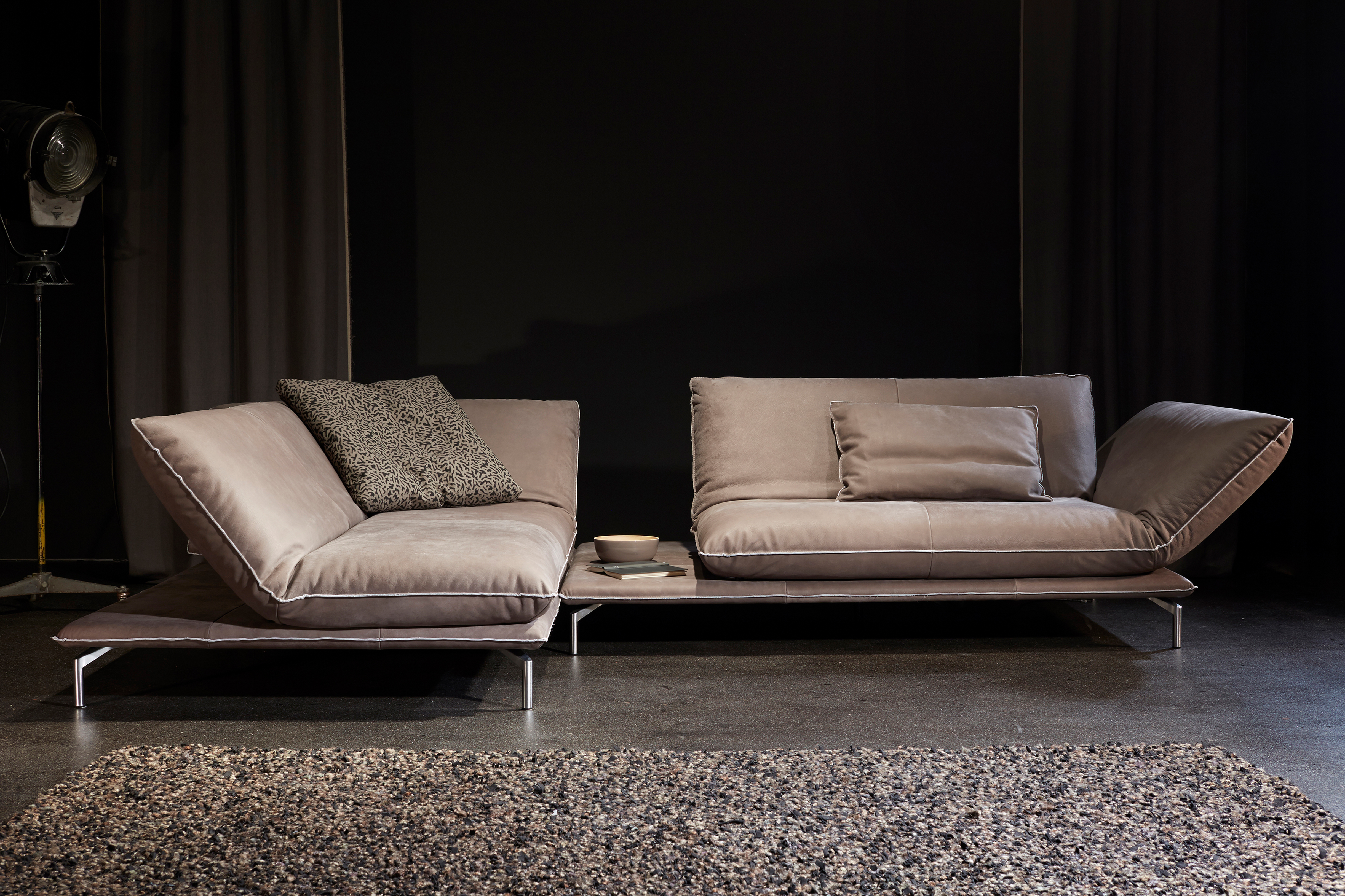 A TOUCH OF CLASS. EDLES ENSEMBLE MIT STIL UND KLASSE. POLSTERELEMENTE, SCHWEBEND SEITWÄRTS VERSCHIEBBAR (MANUELL ODER MOTORISCH), GETRAGEN VON EINEM FEINEN, BEZOGENEN PLATEAU. RÜCKEN- UND ARMTEILE STUFENWEISE BIS ZUR LIEGEPOSITION VERSTELLBAR. OPTIONAL MIT INTEGRIERTER TISCHPLATTE. VERSCHIEDENE BEZÜGE (STOFF/LEDER) UND NAHTVERARBEITUNG WÄHLBAR. METALLFUSS IN UNTERSCHIEDLICHEN HÖHEN UND OBERFLÄCHEN. ALS UNIKAT GEFERTIGT.